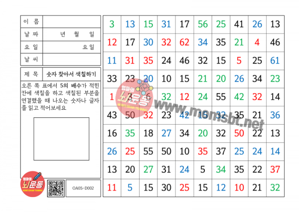 [지남력과 주의력] 숫자 찾아서 색칠하기 - "5의 배수"